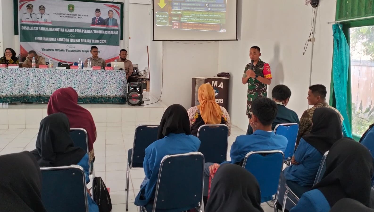 Berlangsung di Aula SMAN 1 Muara Bengkal, 100 pelajar SMA tersebut menghadiri sosialisasi wawasan kebangsaan dengan materi Pengenalan Butir-Butir Pancasila.